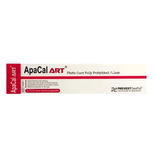 ApaCal ART is a photo-cure, resin-modified, tricalcium phosphate pulp protectant/liner fortified with hydroxyapatite. It is designed to perform as a barrier and to protect the dentine pulp complex. Its unique, active release technology is useful in pulp capping and as a protective base/liner under dental filling materials, cements, and other restorative materials.
