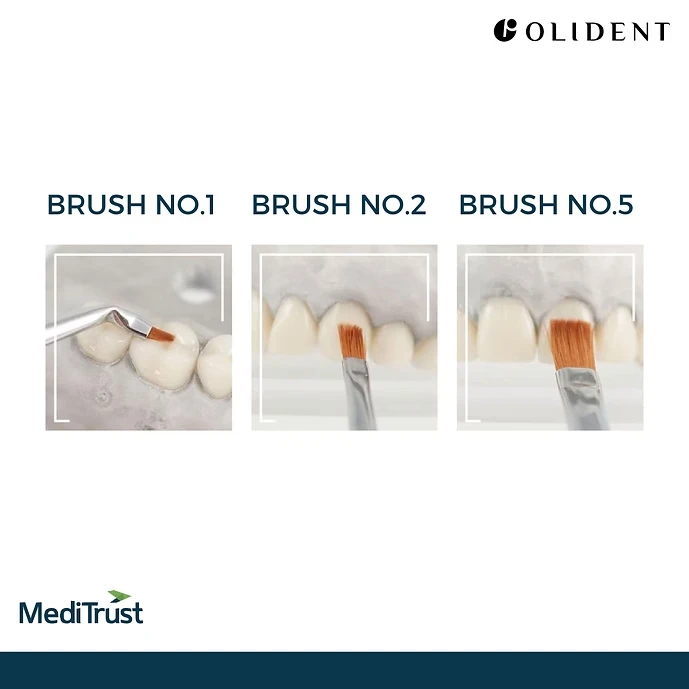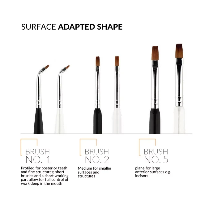 OliBRUSH no. 1 – profiled for posterior teeth and fine structures; short bristles and a short working part allow for full control of work deep in the mouth.