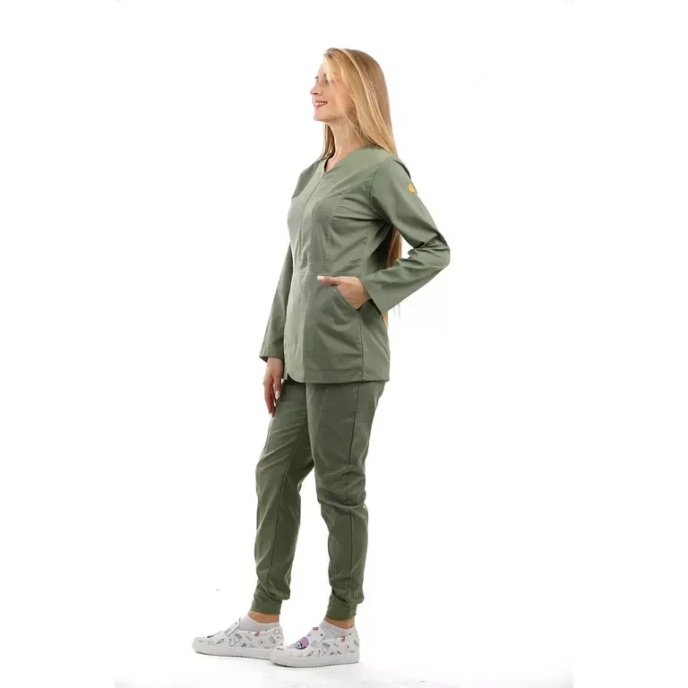 المزايا: سكراب علوي من قماش الليكرا على شكل زهرة التيوليب , جيوب امامية , سحاب على الصدر غير مرئي ,  مريح جدًا للأطباء الذين يعملون بجهد , تصميم سروال فاخر يتميز بجيبين أماميين , اساور مطاطية في القدم بشكل جمالي