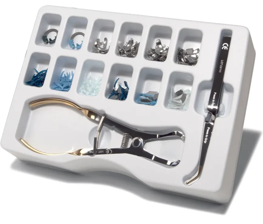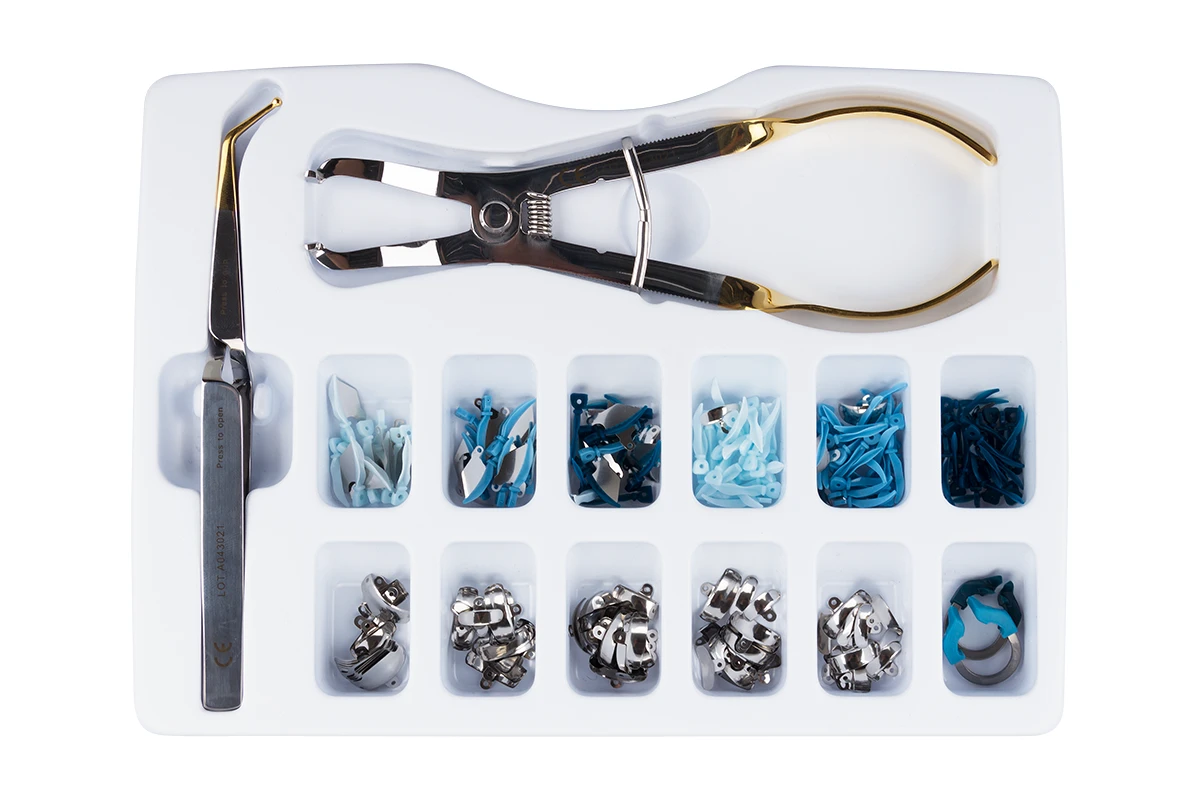 The system includes a molar and premolar ring, 5 different sized tabbed matrix bands, 5 different sized EZ coat bands, 3 wedges, 3 wedgeguards and specially designed pin-tweezers and forceps. All components work together easily and deliver predictable tight contacts, tight gingival seal, minimized flash and finishing.