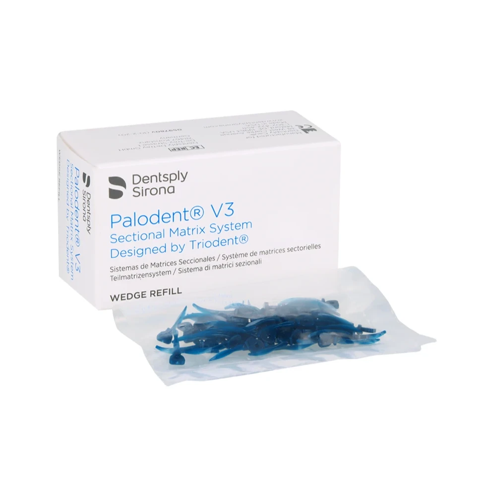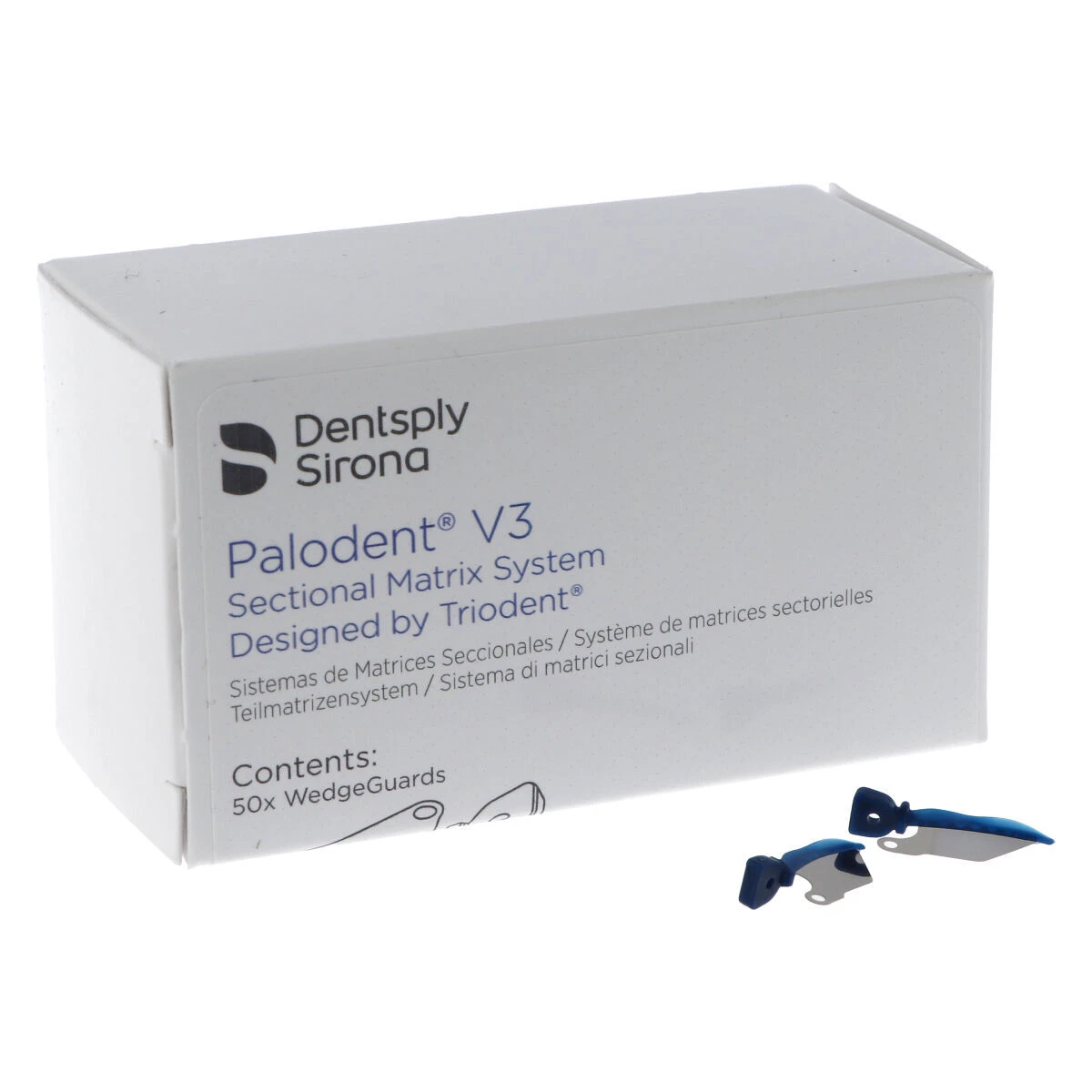 The Palodent® V3 Sectional Matrix System employs a nickel-titanium retaining ring, interproximal wedge, WedgeGuard and sectional matrices for placement of restorations in the posterior region. Sectional matrices are suitable for use with all posterior restorative materials.