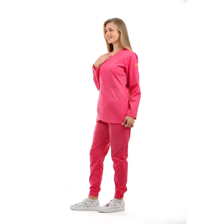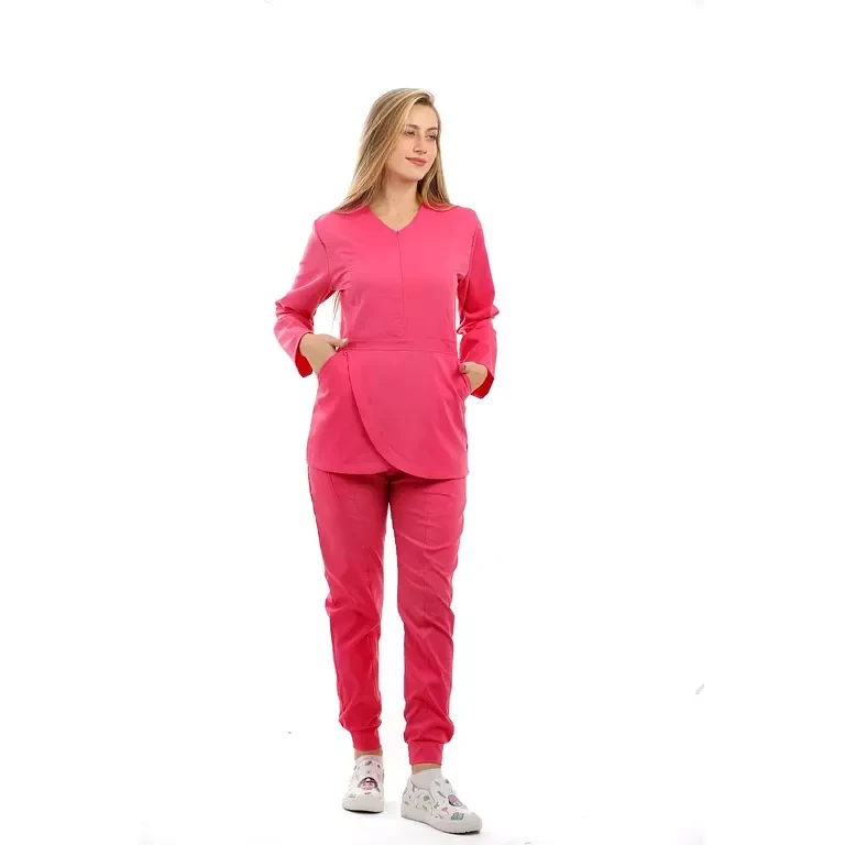 المزايا: سكراب علوي من قماش الليكرا على شكل زهرة التيوليب , جيوب امامية , سحاب على الصدر غير مرئي ,  مريح جدًا للأطباء الذين يعملون بجهد , تصميم سروال فاخر يتميز بجيبين أماميين , اساور مطاطية في القدم بشكل جمالي