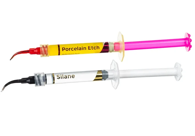 Ultradent 90-second Porcelain Etch is used to etch porcelain veneers, crowns, bridges, inlays, onlays, and fractured dental porcelain. Ultradent 60-second Silane is used after hydrofluoric acid etching to prepare the surface for bonding resin.