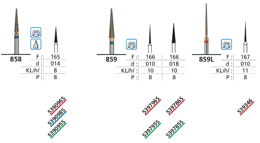 High-speed FG diamonds are available in standard FG shank, in FG short shank, and for some items in long shank. In addition, DFS Diamon manufactures FG diamond burs for minimally invasive applications and FG Turbo diamonds with spiral. FG Turbo diamonds are primarily used in crown and cavity preparation.