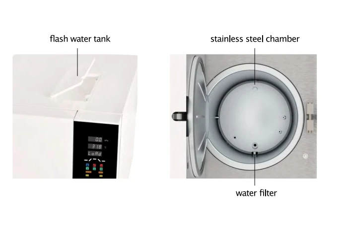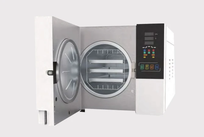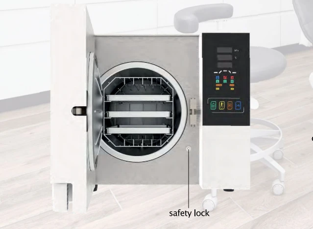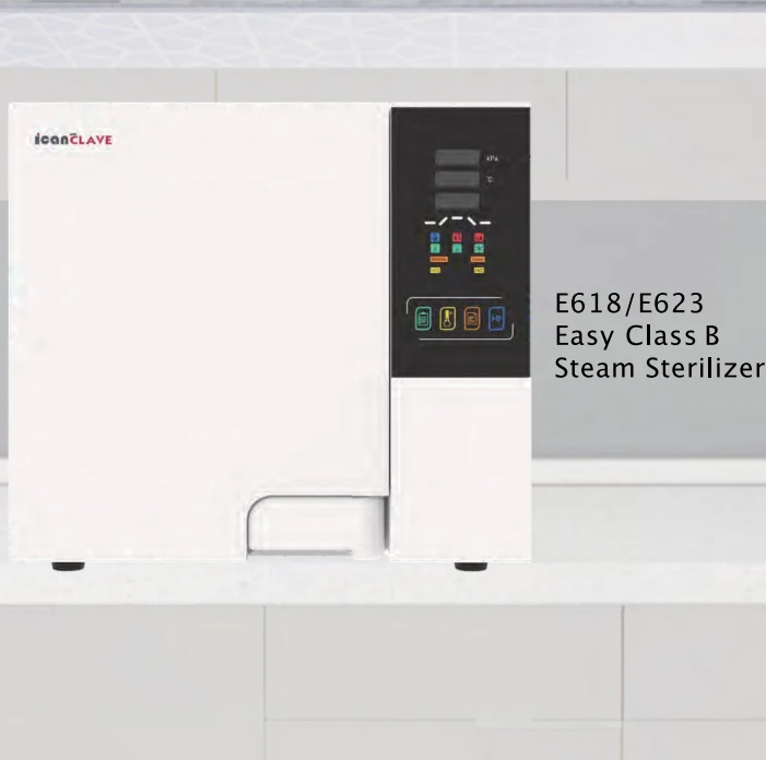Icanclave autoclave STE-23-C. Features: - Fully automatic benchtop autoclave with pre-set programs. - Complies with European standard EN 13060 (Class B only). - In-built independent rapid steam generator ensures quick sterilization cycles. - Rapid post-sterilization vacuum drying. - User-friendly interface. - LCD screen displays time, temperature, pressure, process alert, and instrument conditions. - Choice of language settings including English, Spanish, German, and Chinese. - Easily accessible water tank. - Liquid sterilization program optional. Technical specifications: - Model: STE-23-C. - Volume: 23 Liter. - Chamber size: ⌀247 x 450 mm. - Power: 220 W. - Net weight: 51 Kg.