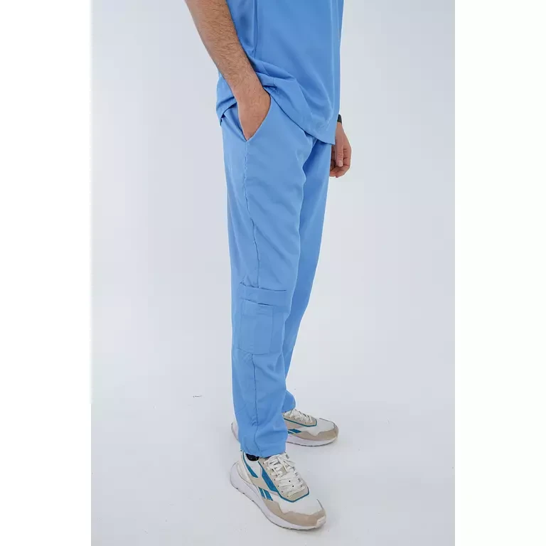 بحزام خصر مطاطي وأربطة. جيوب أمامية، وجيب في الخلف، وجيوب جانبية عند الركبة.
