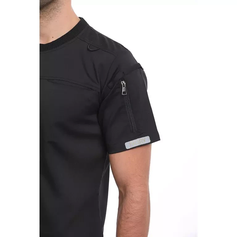 Top: Round Neck shirt featuring a Round Neck, short sleeves, two chest front welt pocket, side shoulder welt zipper pocket.