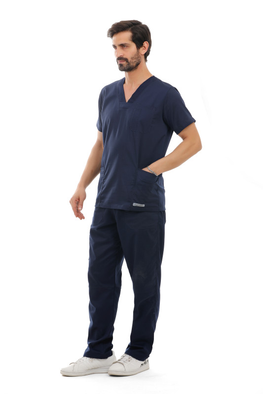 القميص: قميص برقبة على شكل حرف V، يتميز برقبة على شكل حرف V، وأكمام قصيرة، وجيب أمامي على الصدر، وجيوب أمامية على الخصر.