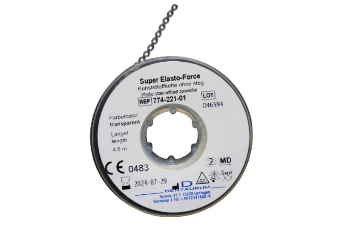 Dentaurum Memory Power CHAIN ELASTIC 4.5M is a dental elastic chain used in orthodontic treatment to move teeth quickly and efficiently. It is made of SUPER Elasto-Force plastic, which is highly elastic and has excellent recoil force.