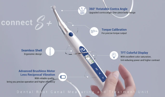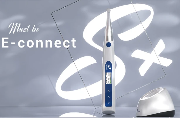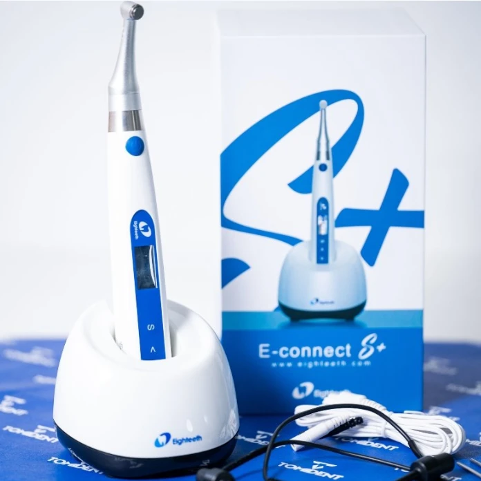 - E-CONNECT S – Cordless endo motor with standalone apex locator One Year Warranty A sneak peak at the new features: 1. Brushless Motor 2. Continuous Rotation– Speed 100 to 1000 RPM 3. Reciprocation – Adjustable speed – Adjustable angles from 30 to 370 4. Apex Locator- Works as a stand-alone apex locator 5. Software – Can be upgraded to latest version with USB – Pre-loaded with all major file systems, which can be further customized