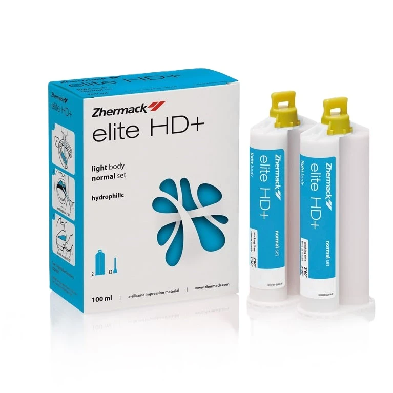 Elite HD+ Light Body (mixing ratio 1:1) is a low viscosity vinyl polysiloxane, recommended for the two-phase (double impression) technique or the one-step (simultaneous) technique, in combination with Elite HD+ Putty Soft or Elite HD+ Tray Material.