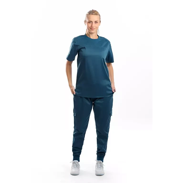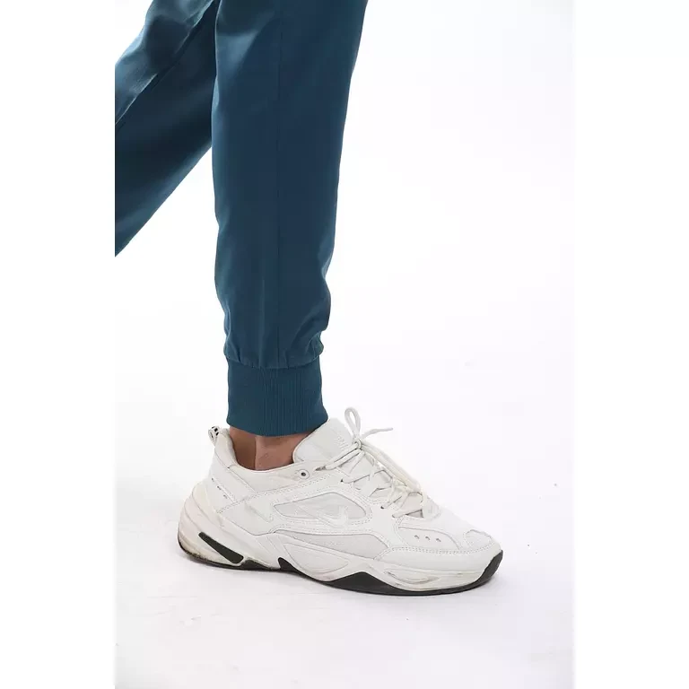 البنطلون: جوقر بحزام خصر مطاطي وأربطة. يتميز بجيوب أمامية، وجيب خلفي ، وجيوب جانبية عند الركبة، وشريط مطاطي في القدم للقدم الخامة:قماش معالج ليكرا بوليستر.
