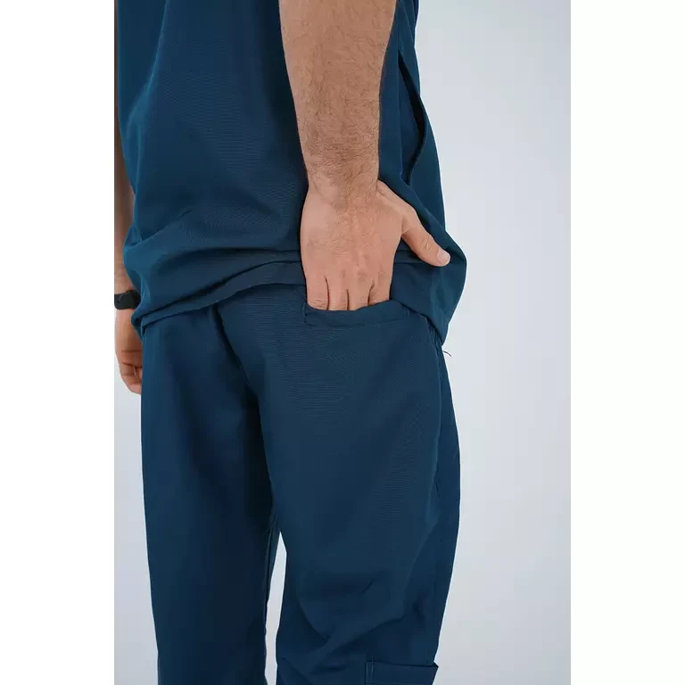بنطلون بحزام خصر مطاطي وأربطة. جيوب أمامية، وجيب في الخلف، وجيوب جانبية عند الركبة.