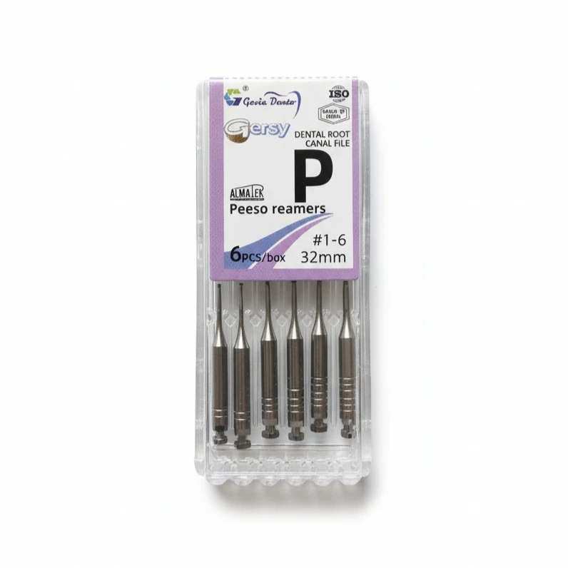 The Gersy Peeso Reamers by Genie Dentar are high-quality rotary endodontic instruments designed for enlarging the coronal portion of root canals and preparing post spaces. This ISO-certified set includes six reamers (#1–6), each with a length of 32 mm, offering versatility and control for a wide range of clinical applications.