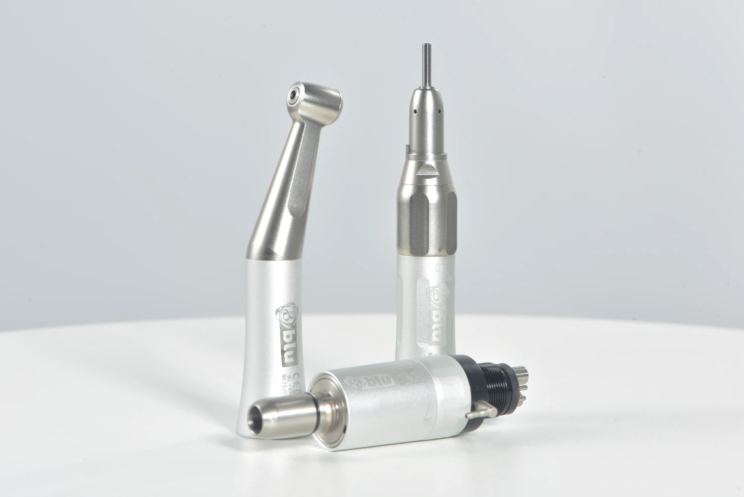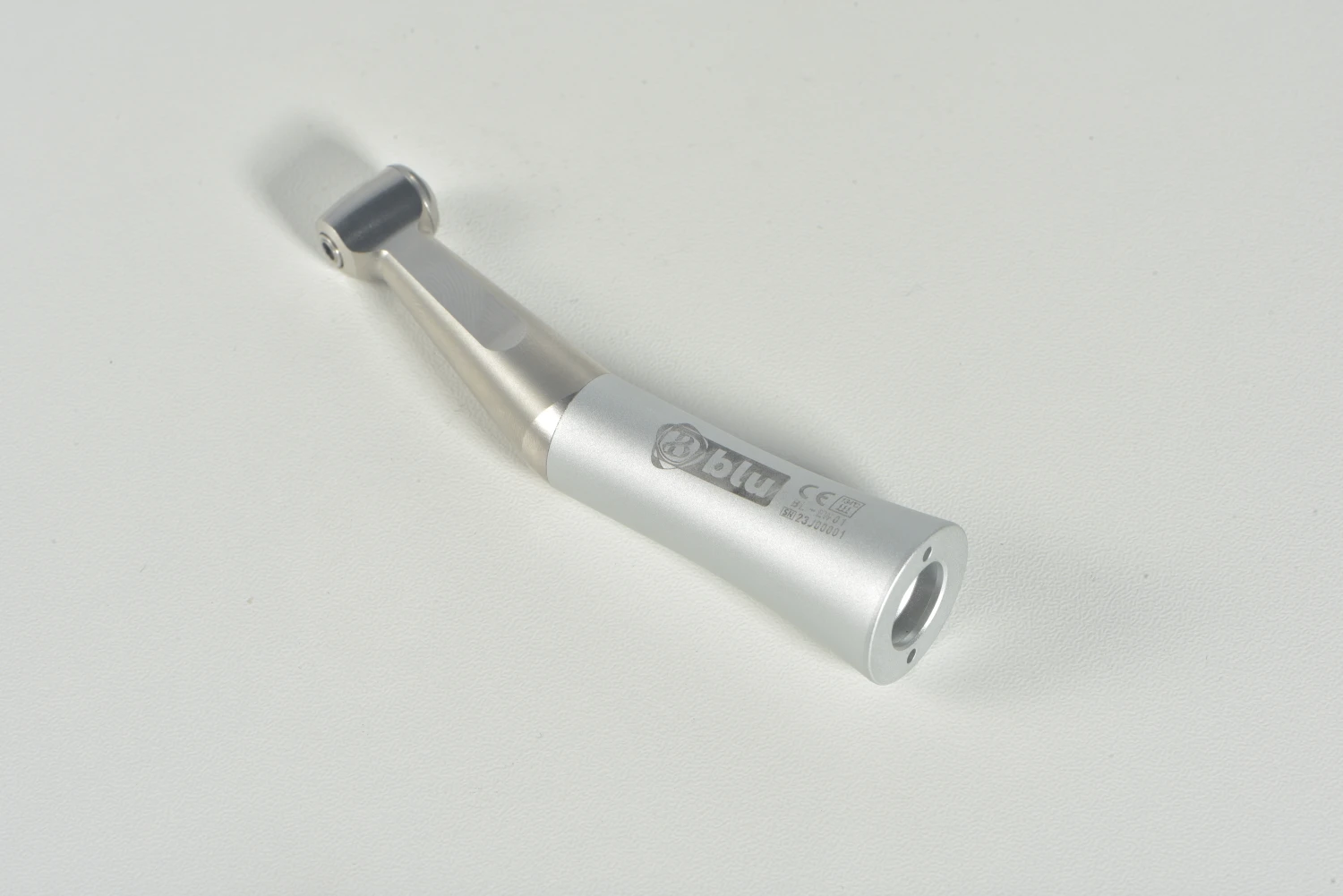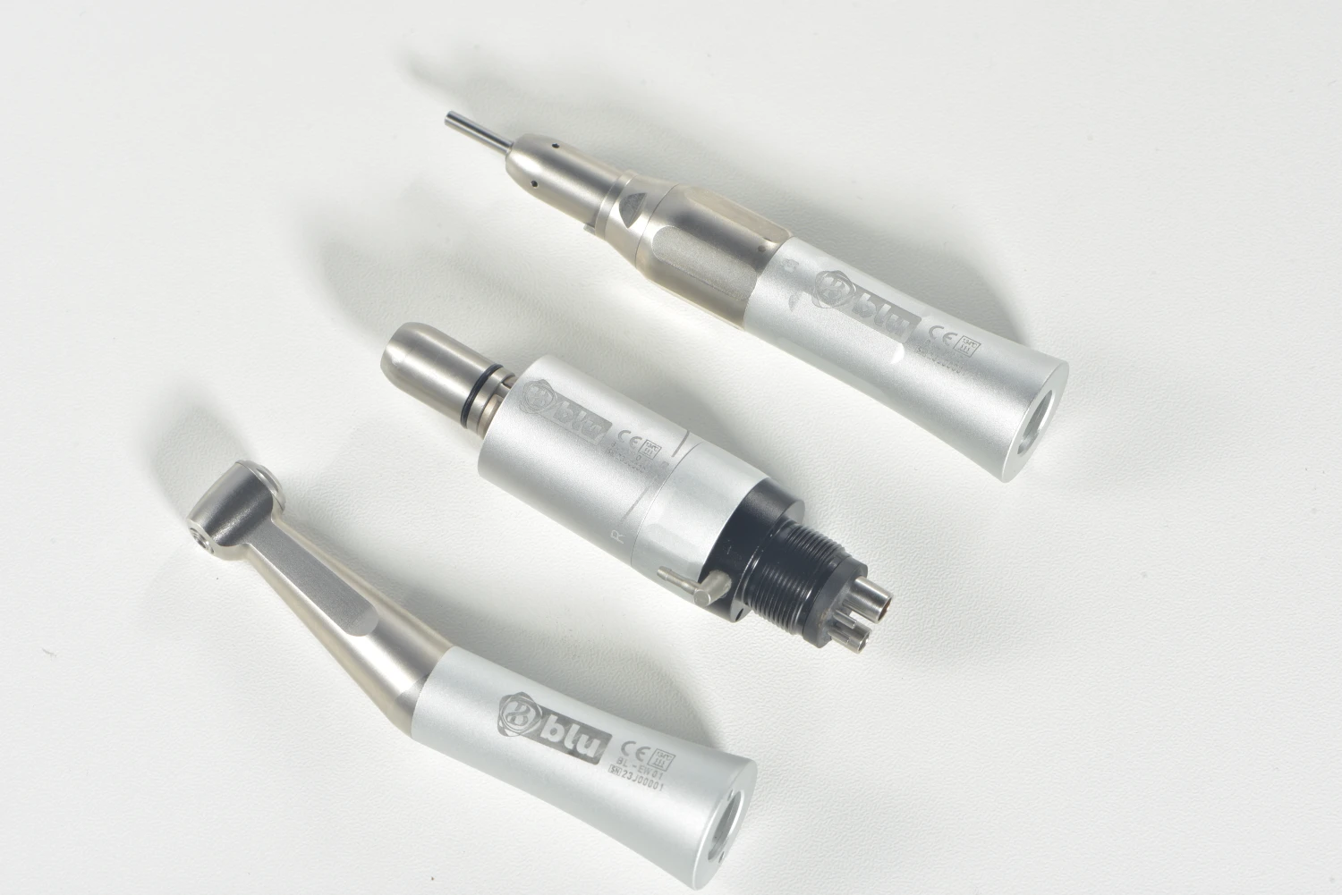 Blu low-speed handpiece external water spray system. Kit contains: Contra angle: Features: - Max Speed: 30,000 rpm. - For CA brush ( 2:35). - Push button chuck. - Hygienic head system.
