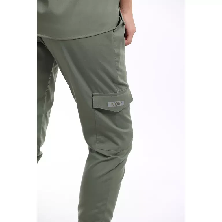 البنطلون: جوقر بحزام خصر مطاطي وأربطة. يتميز بجيوب أمامية، وجيب خلفي ، وجيوب جانبية عند الركبة، وشريط مطاطي في القدم للقدم الخامة:قماش معالج ليكرا بوليستر.