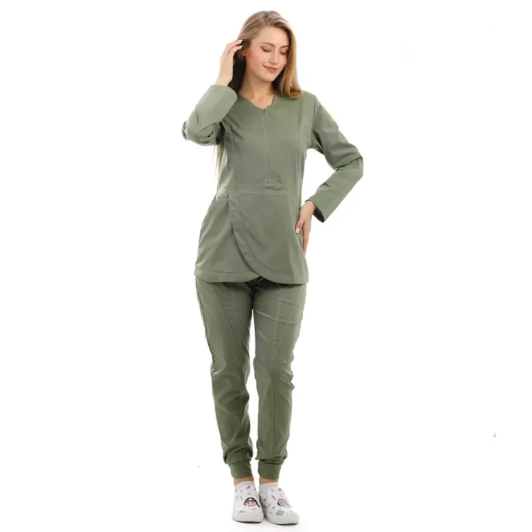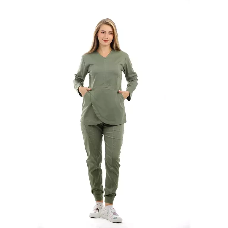 المزايا: سكراب علوي من قماش الليكرا على شكل زهرة التيوليب , جيوب امامية , سحاب على الصدر غير مرئي ,  مريح جدًا للأطباء الذين يعملون بجهد , تصميم سروال فاخر يتميز بجيبين أماميين , اساور مطاطية في القدم بشكل جمالي