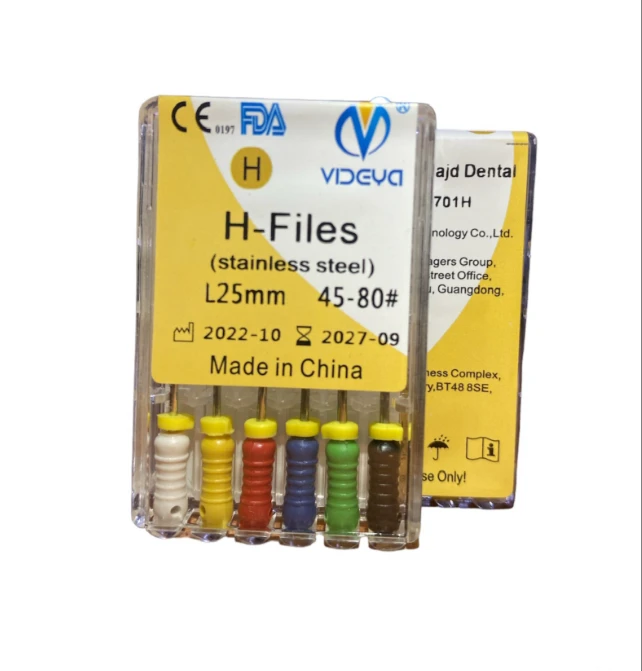 H-files have a rhombic cross-section, weak rotary cutting, tight thread spacing, and a large cross-sectional area. Extremely strong, flexible, and durable for searching root canals, and cleaning and shaping the canal walls.
