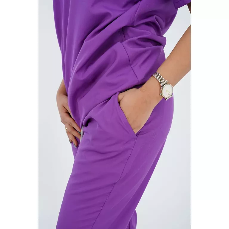 بنطلون بحزام خصر مطاطي وأربطة. جيوب أمامية، وجيب في الخلف، وجيوب جانبية عند الركبة.