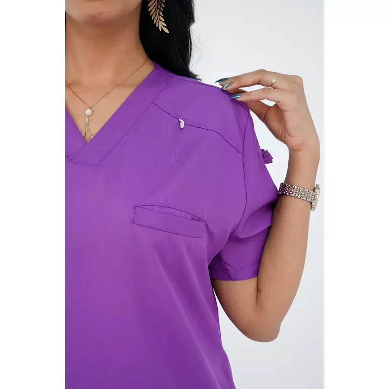 سكراب برقبة على شكل حرف V، يتميز برقبة على شكل حرف V، وأكمام قصيرة، وجيب أمامي على الصدر ، وجيوب جانبية في الوسط ، وفتحات جانبية عند الخصر.