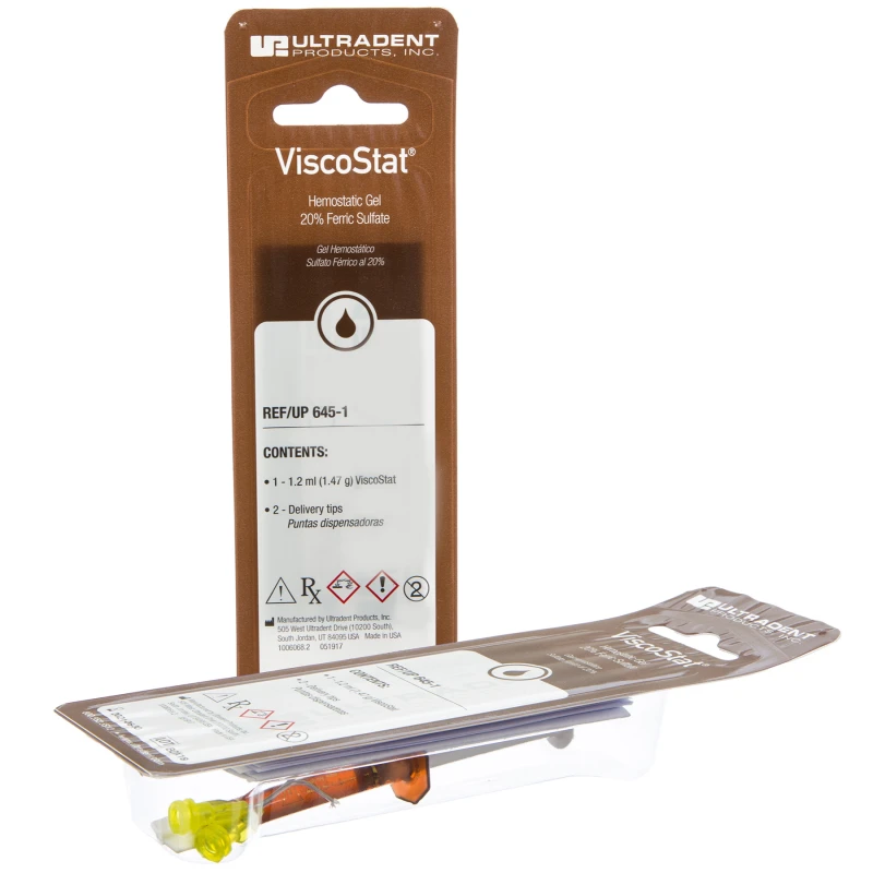 ViscoStat hemostatic is a 20% ferric sulfate equivalent solution with inert binding agents in a viscous, aqueous vehicle. It has a pH of ~1.0 and contains patented, fumed silica to limit the acidic activity, making it kind to hard and soft tissue.