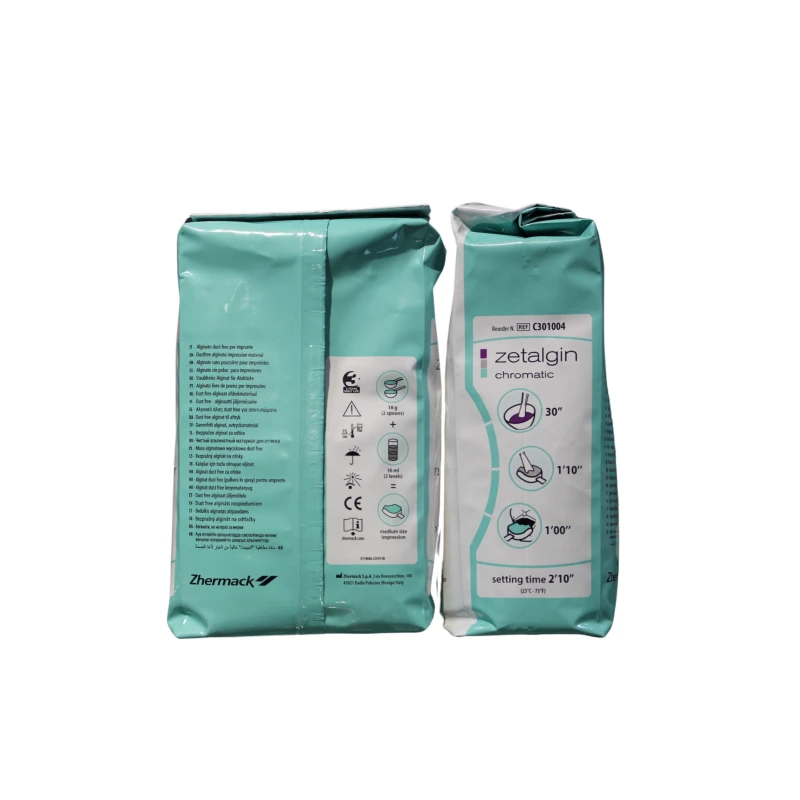 • The chromatic variation provides practitioners with a visual guide during the various processing phases: purple during mixing, grey during the working phase, and green during positioning in the patient’s mouth