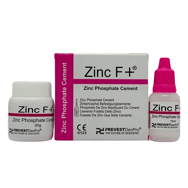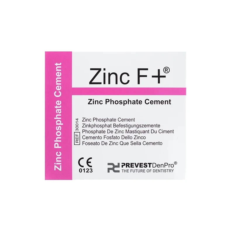 Zinc F+ is a zinc phosphate cement suitable for the cementation of crowns, bridges, inlay facings, and orthodontic brackets. It may also be used for cavity lining under all restorative materials, temporary fillings, and fillings in deciduous teeth.